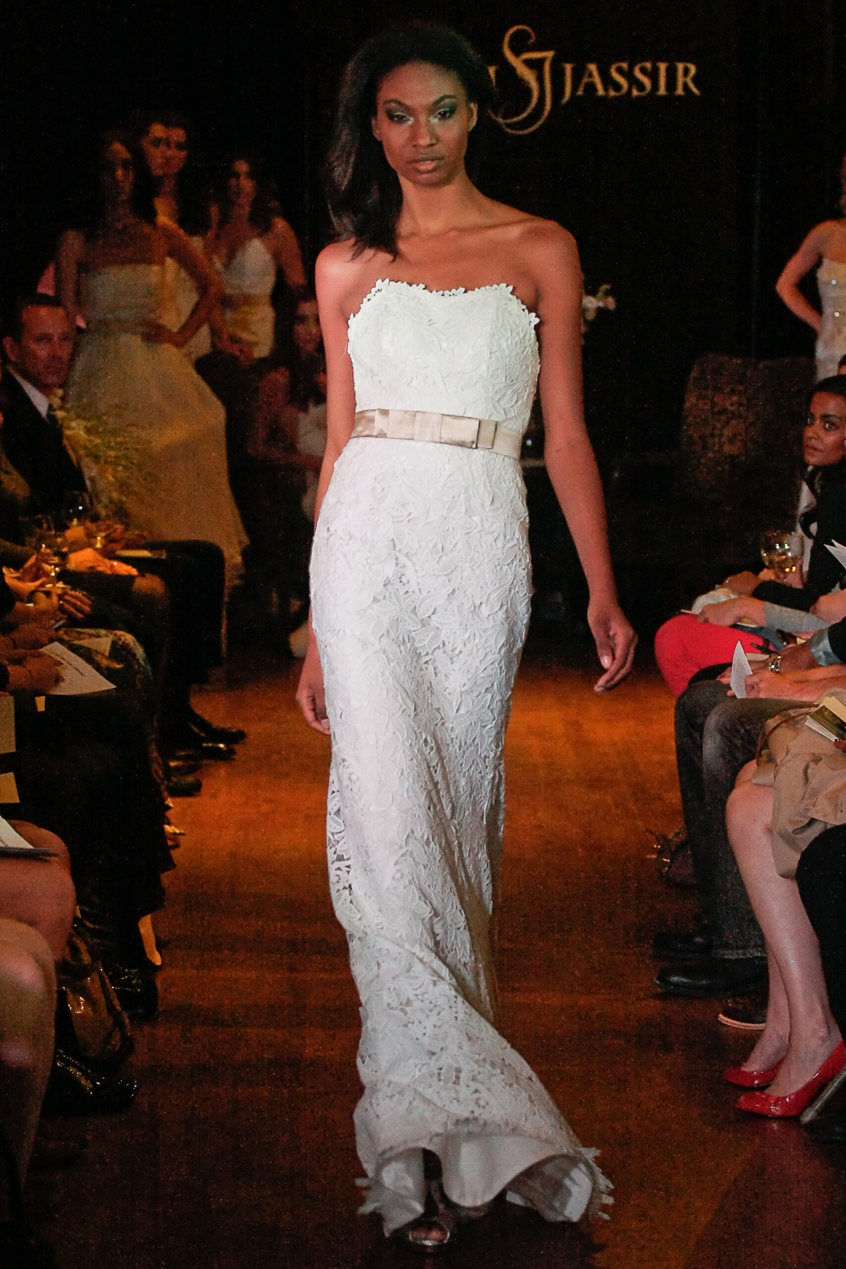 Model walks the runway in a Grace wedding dress – cotton crochet lace gown over silk organza with solk taffeta sash, by Sarah Jassir, for the Sarah Jassir Couture Bridal Fall 2012 Opulence collection.